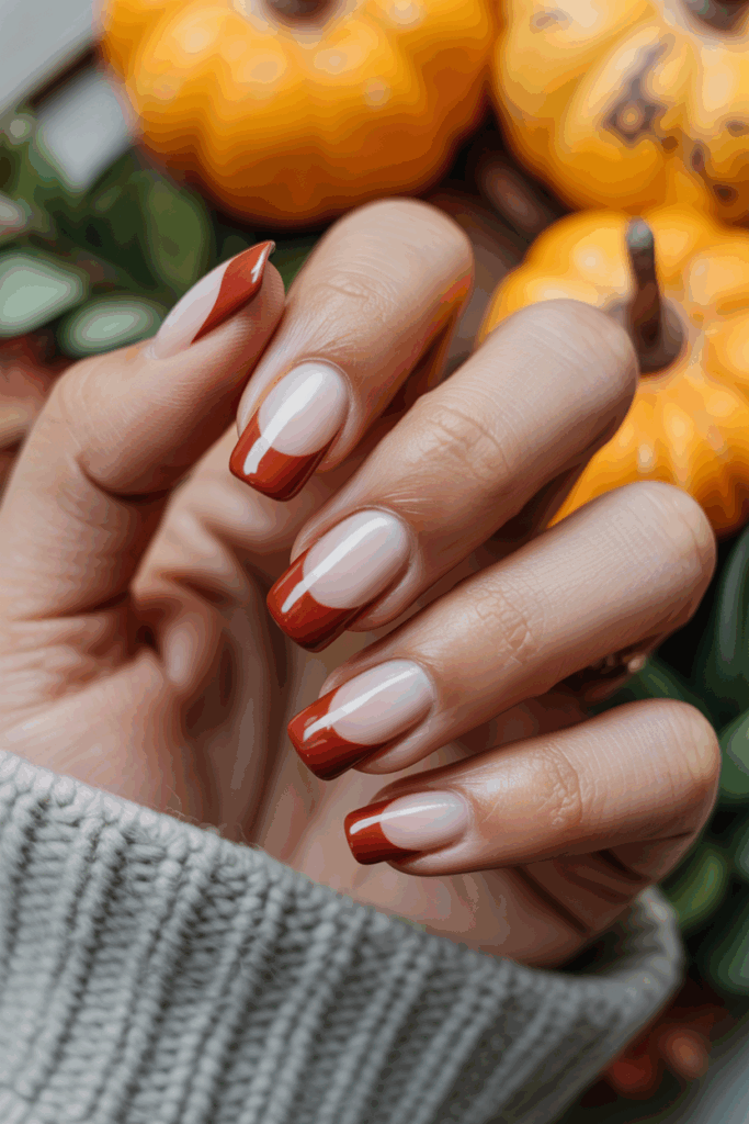 Rust red is a popular fall color for French tips. It offers warmth and matches autumn styles well. The look is simple but stylish, keeping the classic French tip shape with a seasonal twist. It works on all nail lengths and shapes.