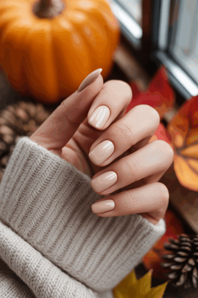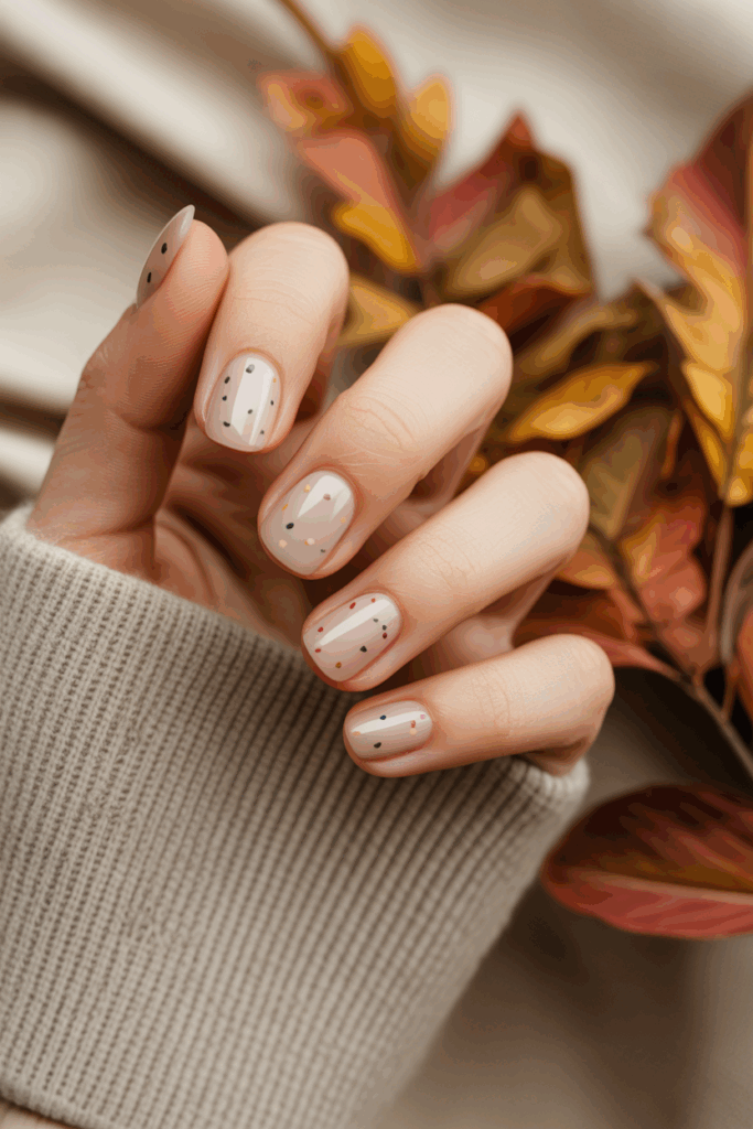 This design uses a soft beige base that feels warm and simple. Tiny dots in a subtle color add a delicate detail without making the nails look busy. It fits well with fall’s cozy vibe while staying clean and elegant.