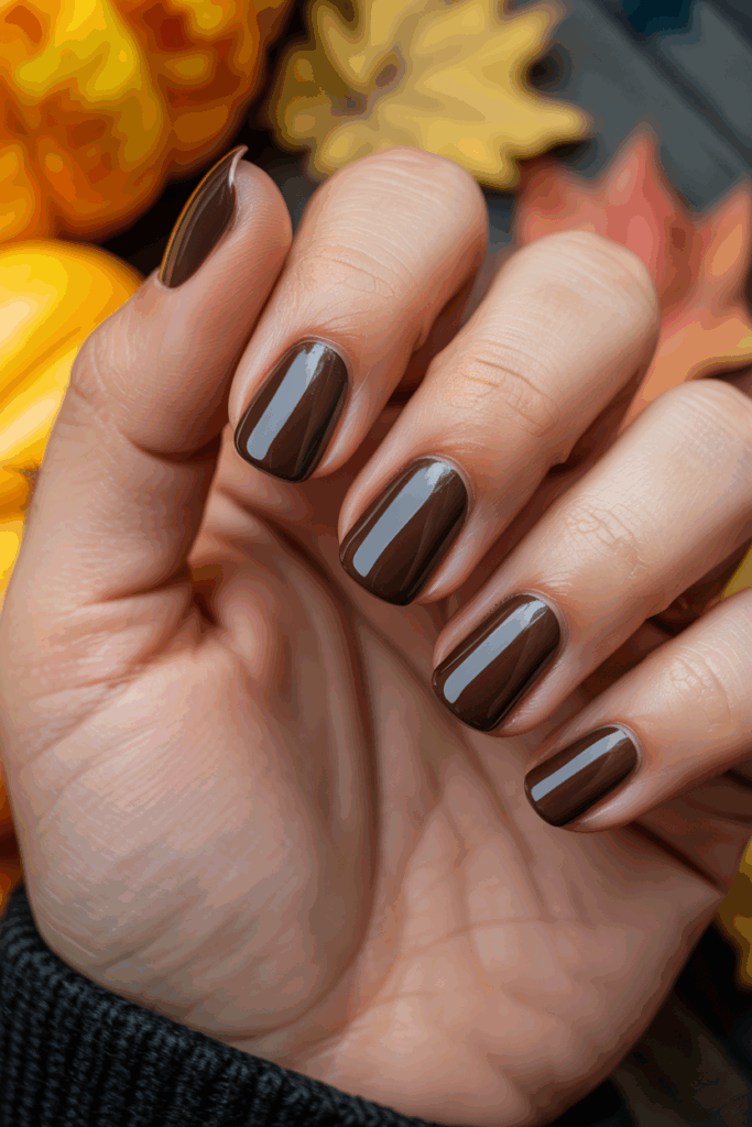 Dark chocolate brown nails offer a rich and classic look for fall. The glossy finish adds a smooth shine that makes the color stand out.