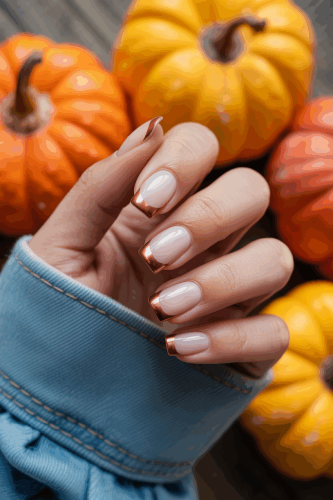This style uses thin, precise French tips paired with copper lines for a modern touch. The copper adds a warm, metallic look perfect for fall. It balances simplicity with a bit of shine, making nails look sleek and polished.