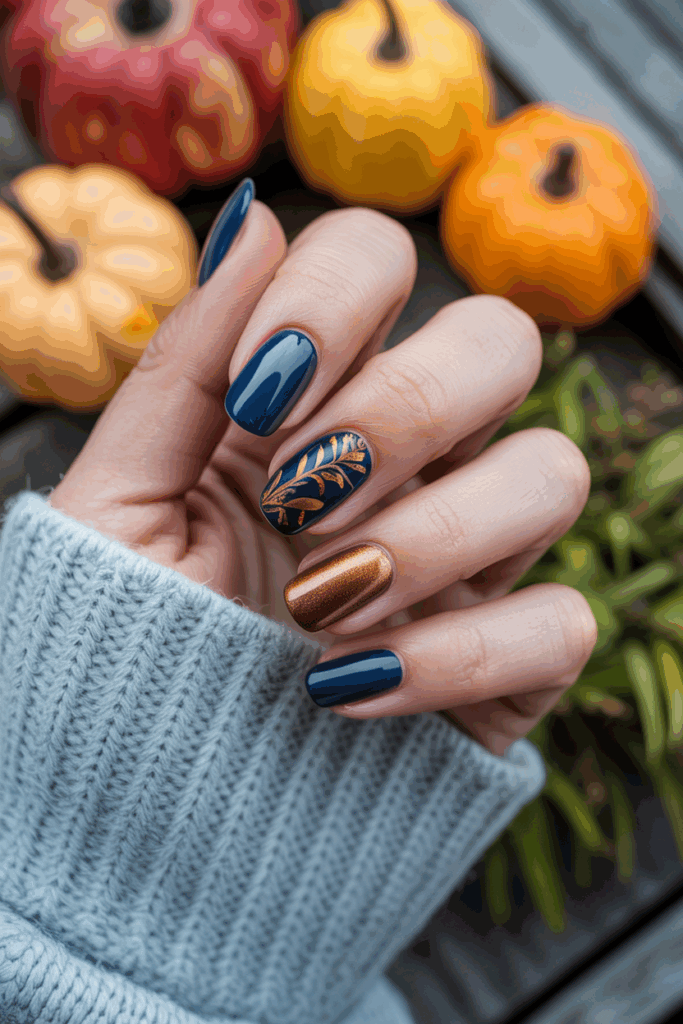 This look pairs deep navy blue matte nails with bronze accents. The bronze details add a subtle shine that contrasts well with the matte finish. It’s a simple, elegant design perfect for fall.