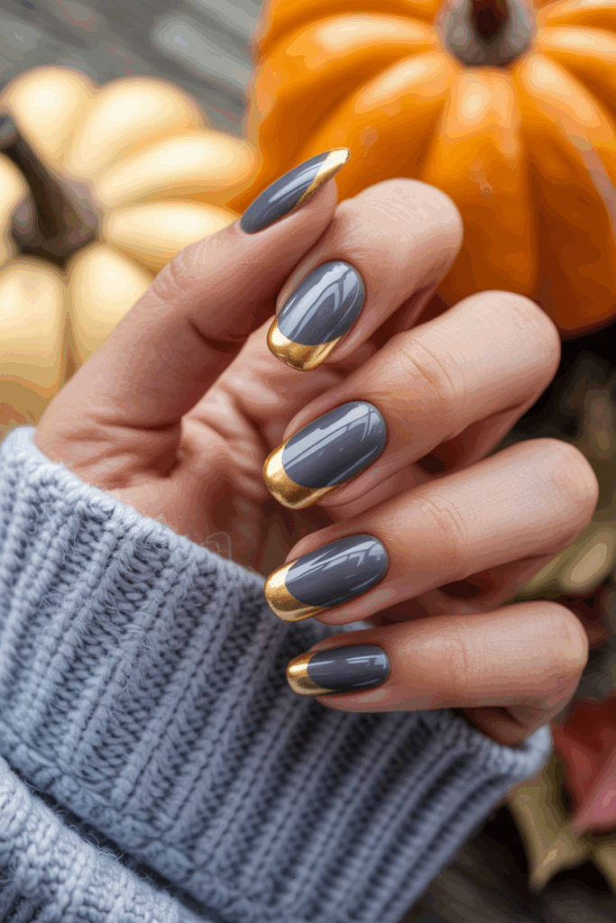 Smoky gray nails offer a calm, stylish look that fits well with fall. The gold tips add a subtle shine, making the design elegant without being too flashy.