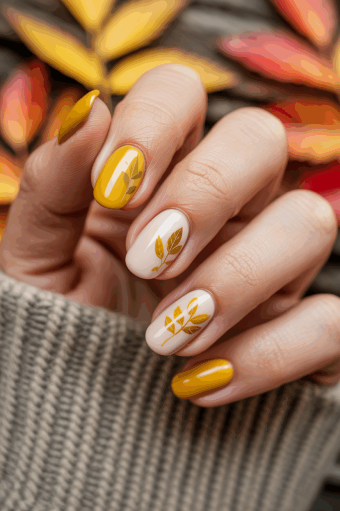 This nail design features a soft mustard yellow base that suits the fall season. Leaf patterns in warm tones add a natural and elegant touch. It works well for those who want a subtle yet stylish autumn look.
