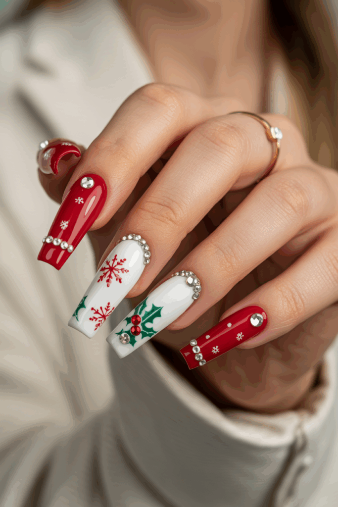 No holiday manicure list is complete without the power of a perfect red polish. Adding a few strategically placed rhinestones at the base or tip transforms everyday red into a celebration. The crystals catch candlelight and add texture without heaviness. It’s a look that bridges timeless glamour with modern minimalism—ideal for Christmas Eve dinners or New Year’s Eve festivities.