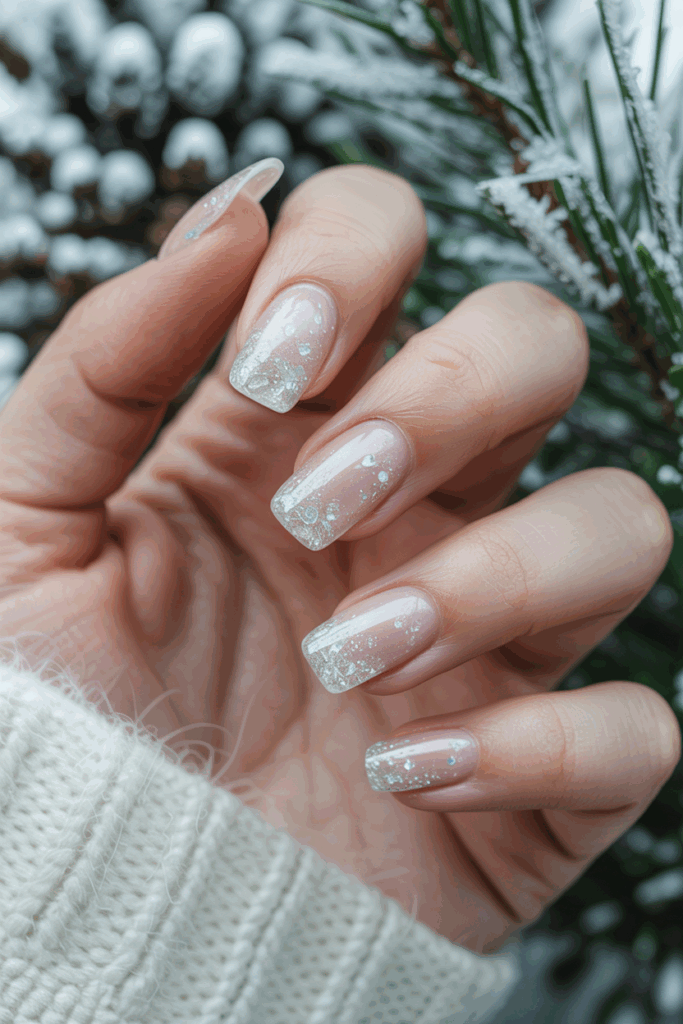 A soft base color, like pale pink or neutral shades, helps the glitter stand out nicely. This style is simple but elegant for winter.